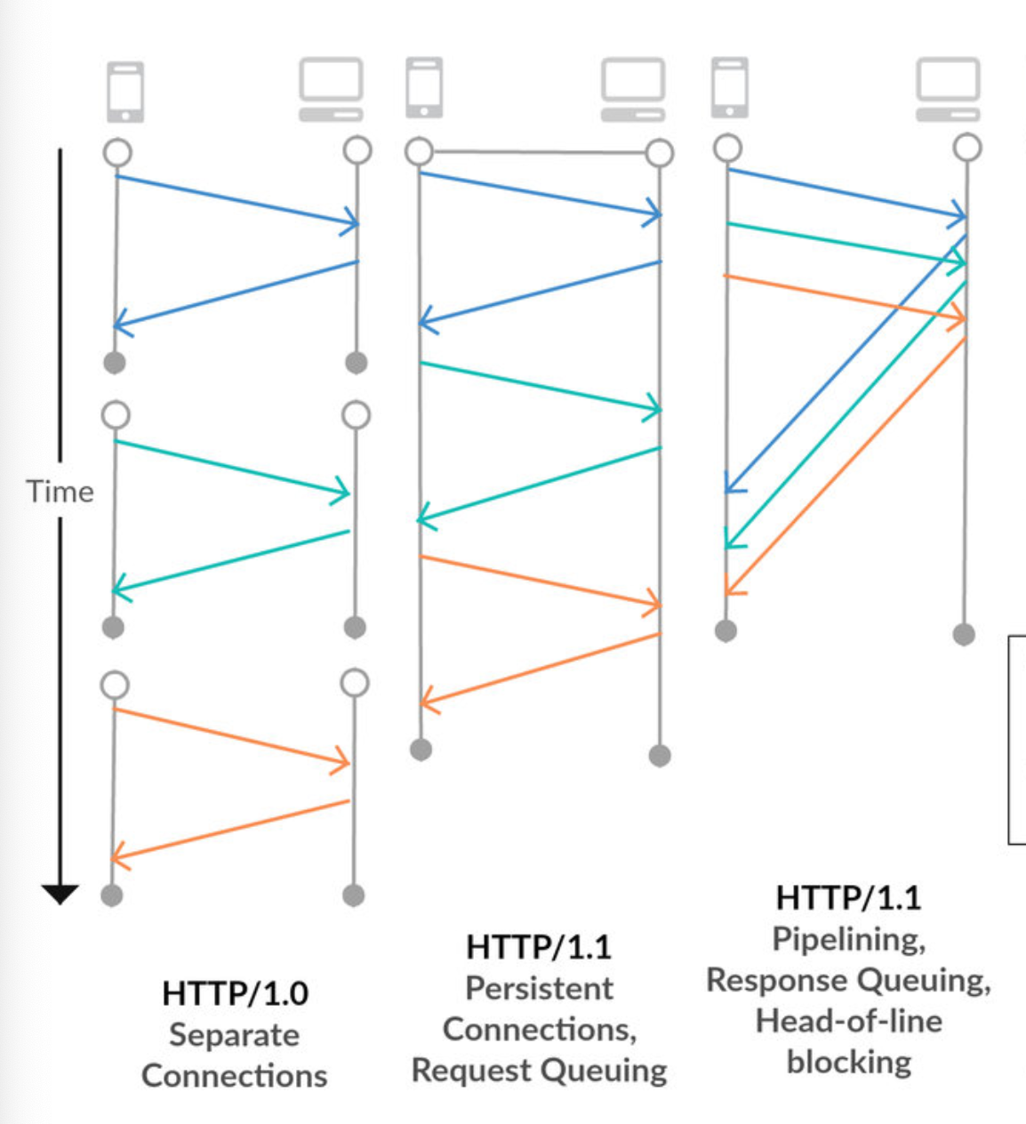 - HTTP 1.1 : 처리는 순차적이기 때문에 여러 연결(TCP 연결) 을 해야했다. -> 속도저하, 네트워크 낭비