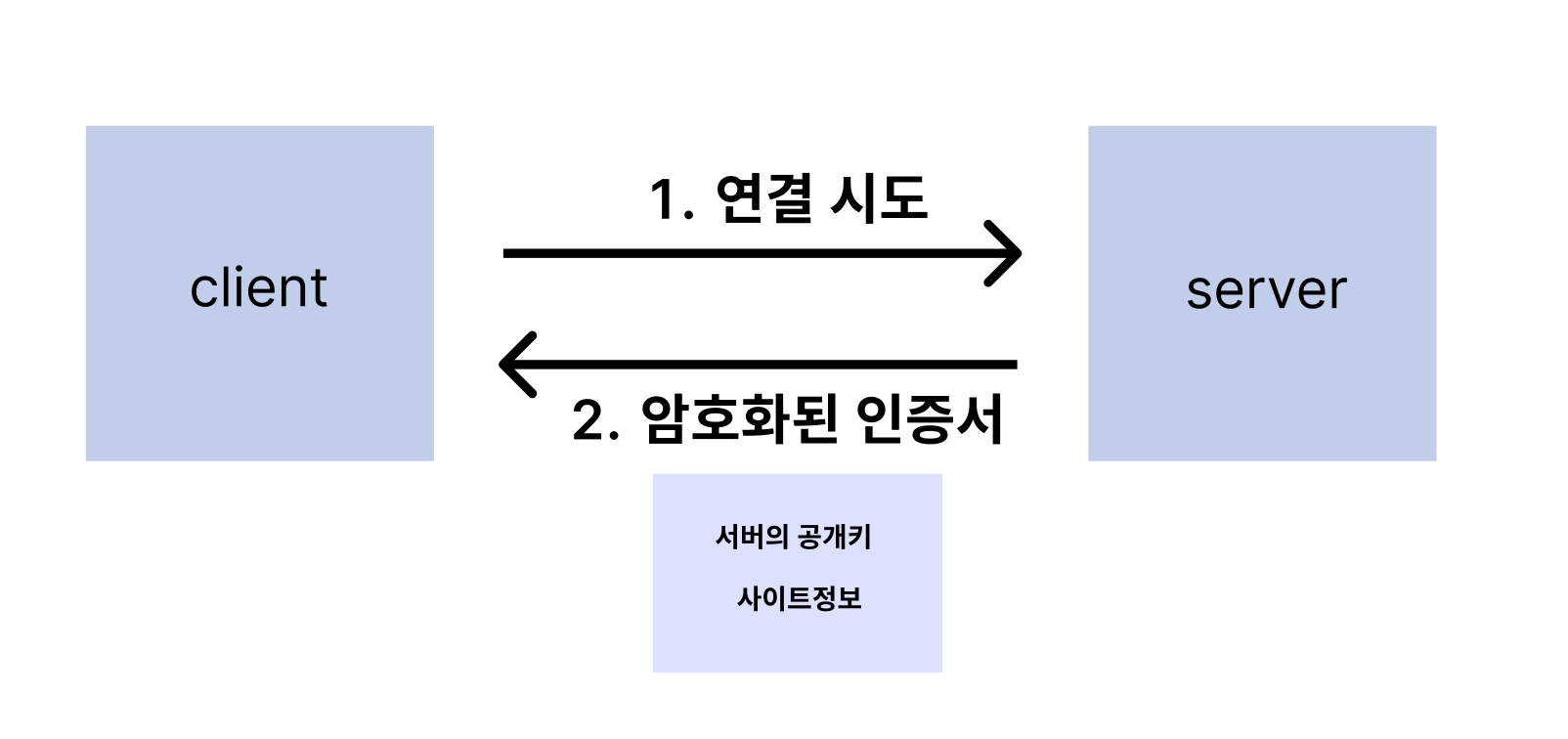 2) 서버는 공개키를 포함한 암호화된 인증서를 클라이언트에게 보냄